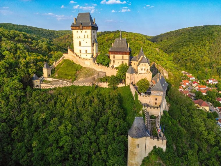 Zamek Karlštejn został założony w 1348 roku przez Karola IV, króla Czech i cesarza Świętego Cesarstwa Rzymskiego. Jego lokalizacja nie była przypadkowa — wzniesiono go około 30 kilometrów na południowy zachód od Pragi, na stromym, zalesionym wzgórzu nad doliną rzeki Berounki. Takie położenie zapewniało naturalną ochronę i doskonałe warunki obronne.