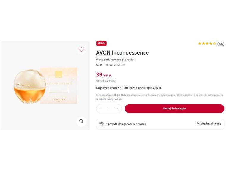 Co więcej, dziś wcale nie trzeba zamawiać ich u konsultantki. Już od jakiegoś czasu niektóre zapachy marki Avon można kupić stacjonarnie w sklepach Rossmann. Incandessence kosztuje tam zwykle 65,99 zł za flakon o pojemności 50 ml, a teraz można kupić go na promocji za 39,99 zł.