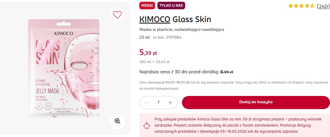 Maseczka do twarzy KIMOCO Glass Skin dostępna w trwającej obecnie promocji Rossmanna kosztuje dokładnie 5,39 zł zamiast 8,99 zł. Jest to produkt w płachcie o rozświetlająco-nawilżającym działaniu, który okazał się prawdziwym hitem w walce z suchą skórą i uczuciem szorstkości. Zapewnia boski efekt „glass skin” w zaledwie 15 minut i już po pierwszym użyciu.