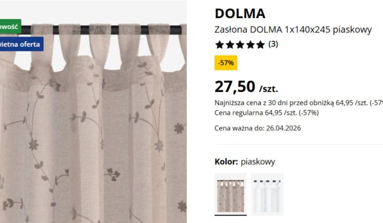 Cena również robi wrażenie, bo jedna sztuka kosztuje 27,50 zł w promocji (do 26. kwietnia). To naprawdę niewiele jak na tekstylia okienne o tak dopracowanym wyglądzie. Dodatkowym plusem są pętelki, które ułatwiają zawieszenie na karniszu, oraz możliwość skrócenia firanki za pomocą dołączonej taśmy.