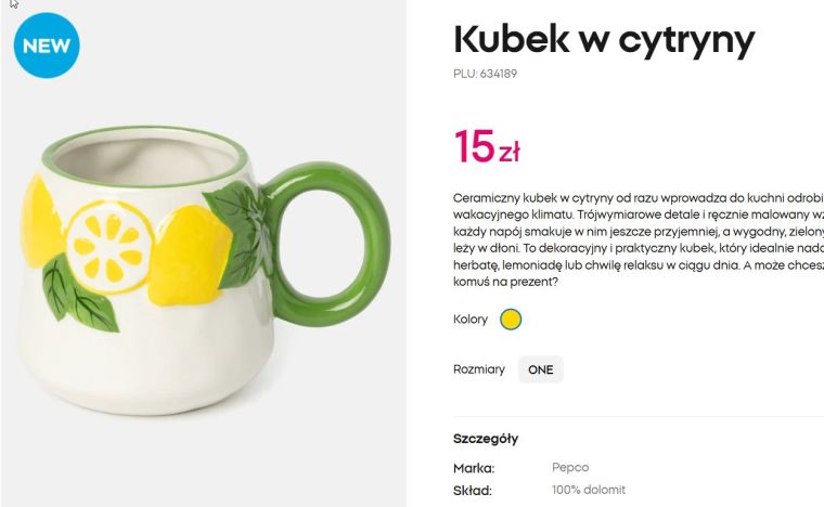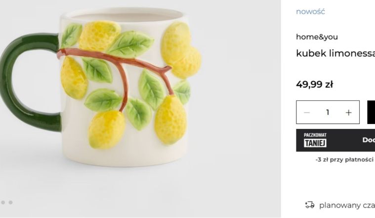 To naczynie ma nieco inny kształt. Kubek ma szerszą podstawę i zwęża się ku górze, co może sprawiać, że nalany do niego płyn dłużej utrzyma ciepło. Podobnie jak u „bliźniaka” z Home&You, dekoracyjne cytryny i listki nie są jedynie namalowane, lecz są lekko wypukłe. Cena tego naczynia wynosi 15 zł.