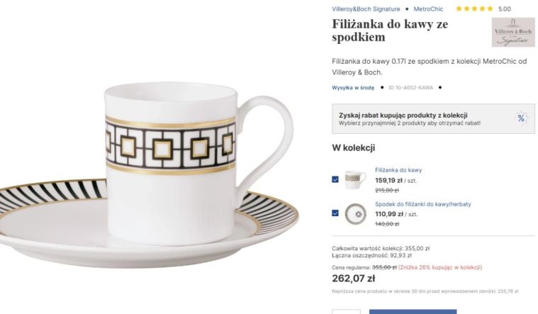 Pocieszeniem dla tych, którym filiżanka ta przypadnie do gustu, może być fakt, że aktualnie znajduje się na wyprzedaży i przeceniono ją na 262,07 zł. Oczywiście nadal jest to zawrotna kwota. Co ważne, cena ta dotyczy całego zestawu – filiżanki i spodka, ale elementy te można zakupić także oddzielnie.