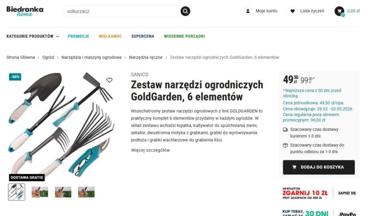 Aktualnie zestaw narzędzi ogrodniczych objęty jest promocją i kosztuje 49,50 zł zamiast 99 zł, co oznacza aż 50% rabatu. Oferta obowiązuje od 28.02 do 03.05.2026, czyli przez cały początek sezonu ogrodowego, ale warto się pospieszyć – takie produkty często szybko znikają, gdy tylko zrobi się cieplej i więcej osób zaczyna prace w ogrodzie.