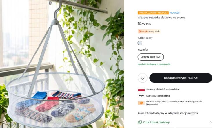 Ta suszarka bierze teraz udział w promocji, która w Sinsay potrwa jeszcze tylko kilka dni. Kupując 4 nieprzecenione produkty, na ostatni z nich, najtańszy, dostaniemy aż 99% rabatu. Warto więc do tej suszarki dobrać kilka praktycznych drobiazgów i skorzystać z promocji. A nawet, jeżeli nie zdążycie, nie ma się czym martwić – ceny są bardzo przystępne również bez obniżek.