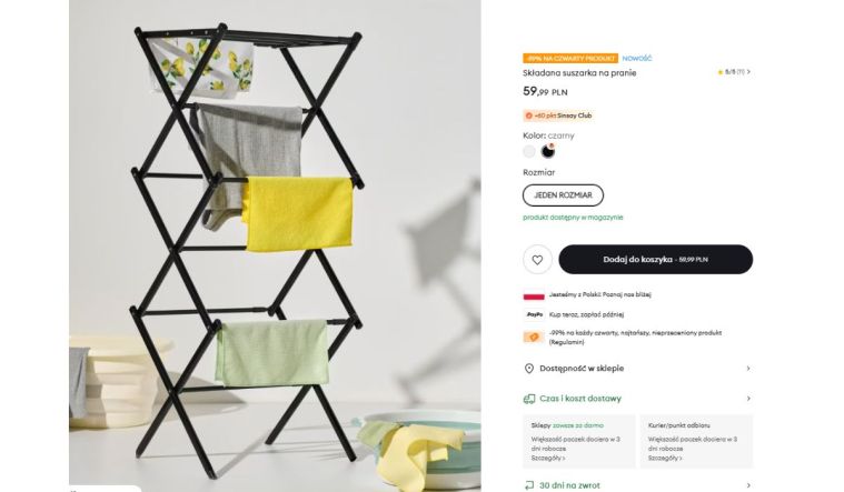 W takiej sytuacji przydaje się rozkładana suszarka w wersji kompaktowej, jak ta z Sinsay. Jest pionowa i zajmuje bardzo mało miejsca – jej wymiary to 40-74 cm x 37 cm x 105 cm. Suszarkę można postawić na podłodze albo pod prysznicem i wygodnie suszyć na niej bieliznę czy ściereczki. Po wszystkim wystarczy ją złożyć i wsunąć za pralkę.