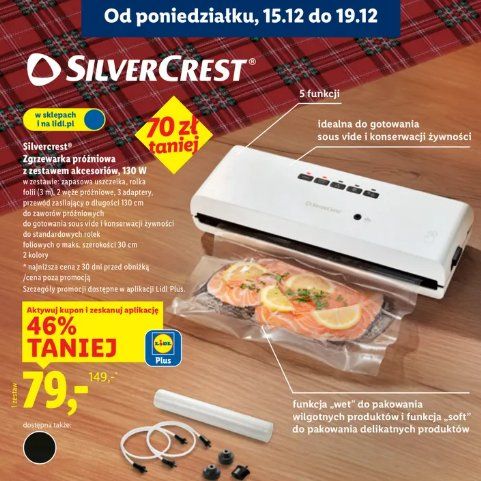 Promocja na zgrzewarkę próżniową marki Silvercrest oraz na zestawy folii do zgrzewarki obowiązuje od poniedziałku, 15 grudnia 2025 r. do piątku, 19 grudnia 2025 r. lub do wyczerpania zapasów. Wszystkie promocyjne ceny wymagają aktywacji kuponu i zeskanowania aplikacji Lidl Plus przy kasie.