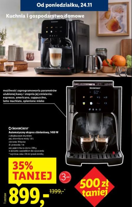 W listopadzie Lidl przygotował promocję, obok której trudno przejść obojętnie. Automatyczny ekspres ciśnieniowy SilverCrest, wyposażony w młynek i szereg funkcji ułatwiających codzienne parzenie kawy, trafi na półki z solidnym rabatem. Zamiast standardowej ceny 1399 zł zapłacisz jedynie 899 zł. Różnica jest naprawdę odczuwalna, zwłaszcza jeśli od dawna rozważasz zakup ekspresu.