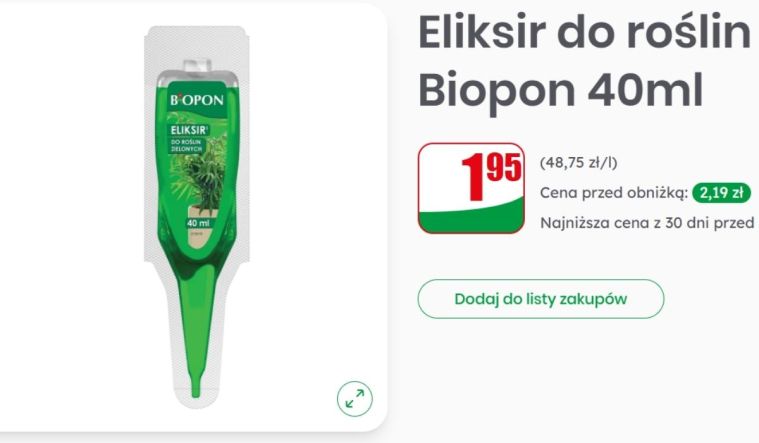 Właśnie tutaj pojawia się eliksir do roślin marki Biopon, dostępny w Dino, który przyciąga nie tylko ceną, ale przede wszystkim prostotą działania. Teraz jest na wyprzedaży i kosztuje tylko 1,95 zł. To niewielka ampułka o pojemności 40 ml, która zawiera skoncentrowany nawóz przeznaczony do roślin zielonych. Jego forma sprawia, że nie trzeba zastanawiać się nad dawkowaniem ani sposobem użycia – wszystko jest już gotowe.
