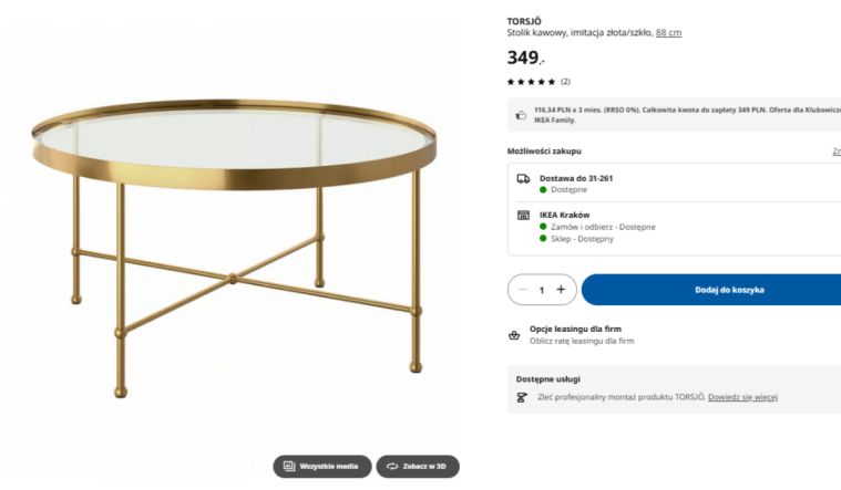 Cena 349 zł może wydawać się standardowa jak na mebel z IKEA, ale w tym przypadku płaci się nie tylko za funkcję, ale też za design. Złota konstrukcja i szklany blat sprawiają, że to nie jest zwykły mebel, tylko element dekoracyjny. Dodatkowym plusem jest możliwość zestawienia go z innymi elementami z tej samej serii. Jeśli ktoś chce stworzyć spójną aranżację balkonu albo salonu, TORSJÖ daje taką opcję bez większego wysiłku.