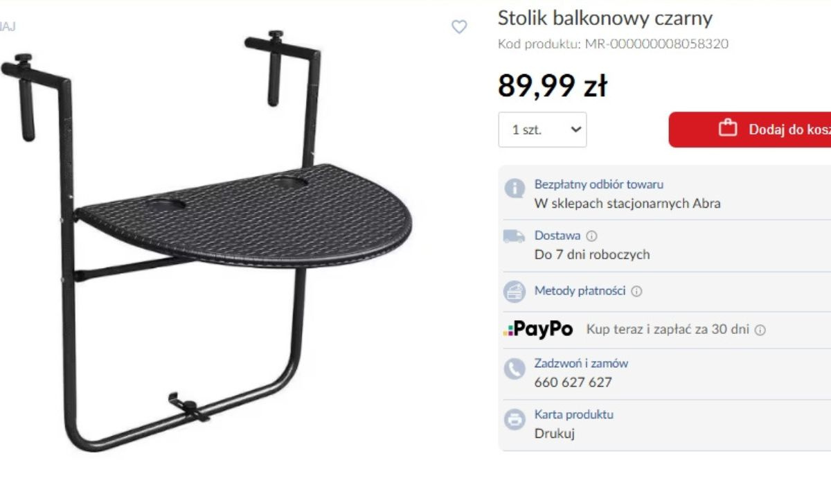 Pleciony stolik w kolorze „obsidian black” na francuski balkon to hit wiosny 2026. Montaż na balustradzie zmienia wszystko