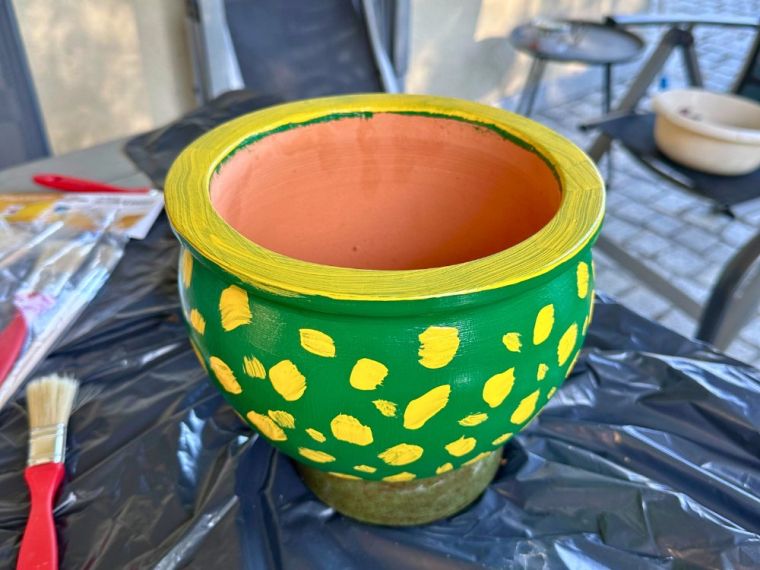 - Wykończenie: na koniec, kiedy farba już wyschnie, malujemy doniczkę lakierem, który utrwala kolor i zabezpiecza farbę.