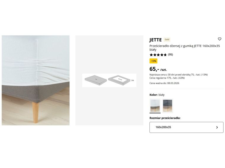W aktualnej ofercie Jysk można znaleźć prześcieradło jersey z gumką z kolekcji JETTE, które przyciąga uwagę przede wszystkim ceną. Regularna cena produktu wynosi 179 zł za sztukę, jednak w ramach promocji została obniżona do 65 zł. Oznacza to rabat sięgający około 63 procent względem ceny regularnej. Informacje o ofercie wskazują też, że najniższa cena z ostatnich 30 dni wynosiła 75 zł, więc obecna promocja jest jeszcze korzystniejsza.