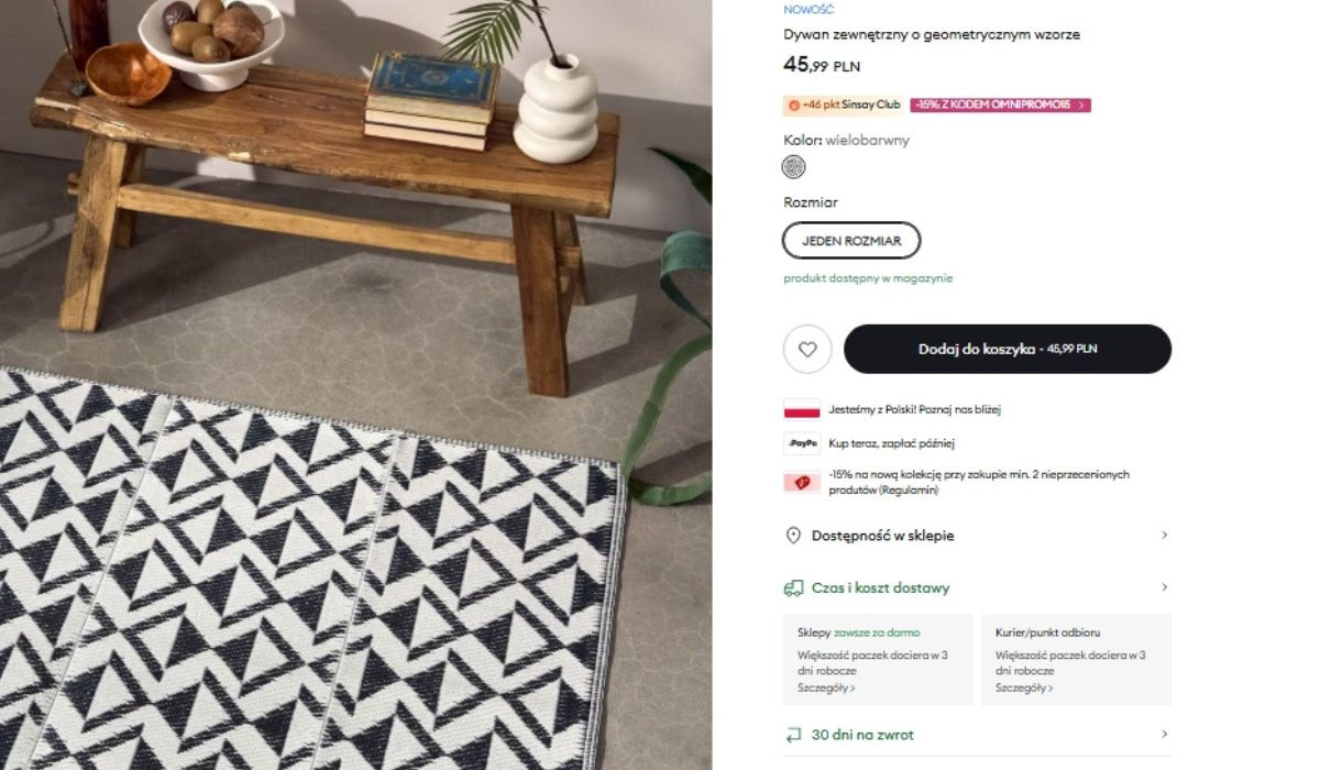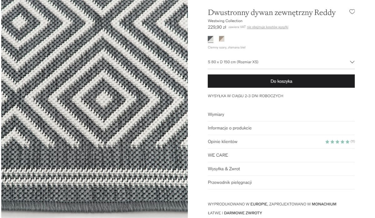Różnica pojawia się dopiero przy cenie. Dywan z Westwing kosztuje 229,90 zł, czyli około pięć razy więcej niż ten z Sinsay. To ogromna różnica, szczególnie jeśli urządzasz balkon i liczysz się z wydatkami.