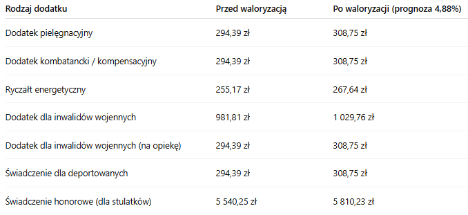 To oznacza, że seniorzy, którzy otrzymują kilka dodatków jednocześnie, mogą zyskać nawet kilkaset złotych miesięcznie. Przykładowo: kombatant, który ma prawo do dodatku kombatanckiego, pielęgnacyjnego i energetycznego, po waloryzacji zyska blisko 42 zł więcej co miesiąc.