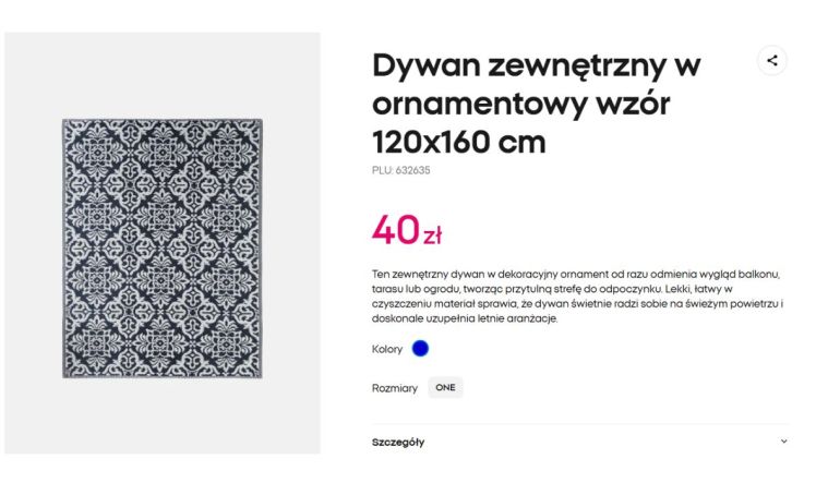 W ofercie Pepco pojawił się dywan zewnętrzny w dekoracyjny, orientalny wzór o wymiarach 120x160 cm, który kosztuje jedynie 40 zł. To właśnie cena przyciąga uwagę, ale już po chwili w oczy rzuca się również sam design i staranne wykończenie. Charakterystyczna arabeska w kontrastowych kolorach sprawia, że dywan prezentuje się elegancko i z łatwością wpisuje się w modne aranżacje balkonowe oraz tarasowe.