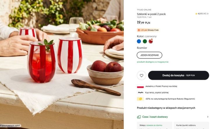W ofercie Sinsay pojawiły się szklanki, które trudno pomylić z klasycznymi, przezroczystymi modelami. To zestaw dwóch sztuk zdobionych wyrazistym, pionowym wzorem w paski, dostępny między innymi w intensywnym czerwonym kolorze, ale także w innych wariantach. Ich forma jest prosta, ale to właśnie kontrastowe pasy nadają im wyjątkowego charakteru i sprawiają, że wyglądają jak element starannie zaprojektowanej zastawy.