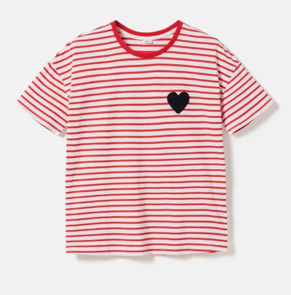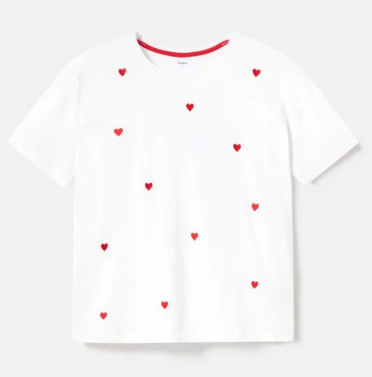 Równie minimalistyczna, choć bardziej subtelna, jest biała koszulka z drobnymi haftowanymi sercami, wykonana w 100% z bawełny – także w cenie 20 zł. W kolekcji znalazła się również koszulka w czerwono-białe paski z kontrastowym sercem z frotty, która kosztuje 25 zł. Ten model najmocniej nawiązuje do paryskiego stylu, kojarzącego się z marynarskimi paskami i prostą elegancją.