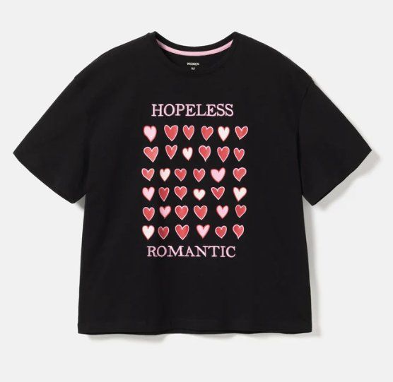 Bazą kolekcji są bawełniane koszulki z krótkim rękawem, które łączą klasyczne kroje z romantycznymi akcentami. Czarna koszulka z nadrukiem serc i napisem „Hopeless Romantic” kosztuje 20 zł i przyciąga uwagę wyrazistą grafiką w odcieniach czerwieni i różu. To propozycja dla kobiet, które lubią modę z charakterem, ale nadal w casualowym wydaniu.