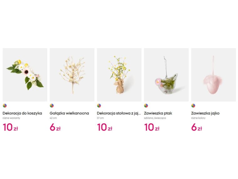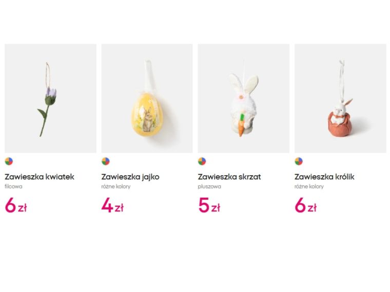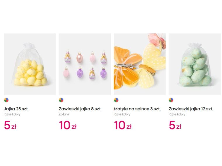 W ofercie nie brakuje również zawieszek: jajko w różnych kolorach za 4 zł, skrzat za 5 zł, królik za 6 zł czy kwiatek za 6 zł. Bardziej rozbudowane zestawy, takie jak szklane zawieszki jajka 8 sztuk za 10 zł czy komplet 12 jajek za 5 zł, pozwalają szybko wypełnić przestrzeń stroika bez dużych wydatków.