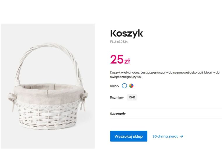 Wśród propozycji, które przyciągają uwagę już od pierwszego spojrzenia, znajdują się dwie uniwersalne bazy do stworzenia wielkanocnego stroika. Pierwsza z nich to klasyczny koszyk wielkanocny w cenie 25 zł. Wykonany z białej plecionki, z materiałową wyściółką i subtelną koronkową lamówką, prezentuje się elegancko i ponadczasowo. Może pełnić funkcję kosza na święconkę, ale równie dobrze sprawdzi się jako dekoracyjna kompozycja na stół lub komodę. Wystarczy wyłożyć jego wnętrze papierową rafią (4 zł), dodać jajka dekoracyjne i kilka drobnych ozdób, by uzyskać gotowy stroik w stylu rustykalnym.