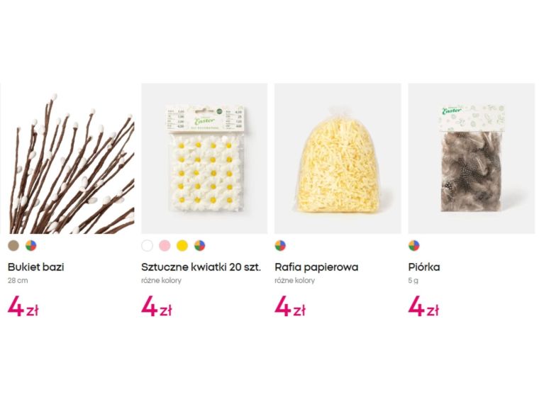 Siłą tegorocznej kolekcji są dodatki, których ceny zaczynają się już od 4 zł. Gałązka wielkanocna o długości 42 cm kosztuje 6 zł i może stać się centralnym punktem kompozycji w wazonie lub koszyku. Dekoracja stołowa z jajkami (10 zł) sprawdzi się jako gotowy element, który wystarczy uzupełnić świecą i zielenią.