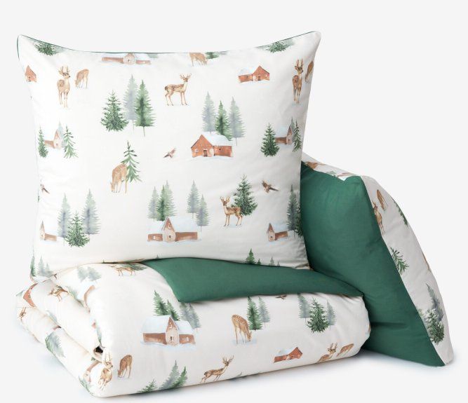 Wzór przedstawia zimowy krajobraz: renifery, choinki i drewniane domki w pastelowej, bardzo przyjemnej kolorystyce. To motyw, który świetnie wpisuje się w świąteczny trend, ale jest na tyle subtelny, że pościel możesz używać przez całą zimę. Kolor zielony nie dominuje wnętrza, wręcz przeciwnie, tworzy spokojną, ciepłą bazę.