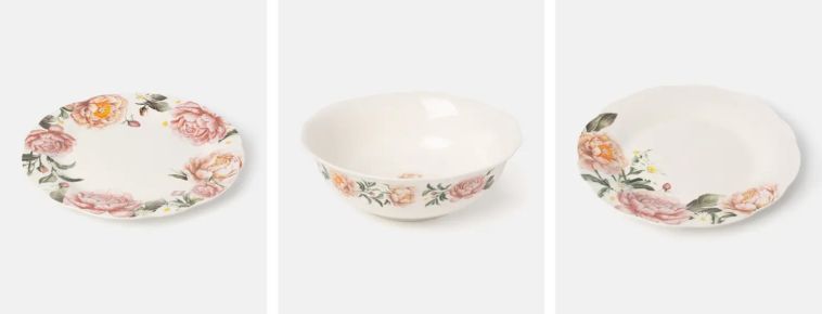 W Pepco dostaniecie talerze, miski i inne niezbędne akcesoria w niskich cenach. Duży talerz obiadowy kosztuje tylko 15 zł za sztukę, a deserowy talerzyk 12 zł. Do kompletu możecie dobrać miskę do serwowania za 25 zł i maselniczkę za 22 zł. Wszystkie naczynia są wykonane z porcelany i ozdobione klasycznym, kwiatowym wzorem.