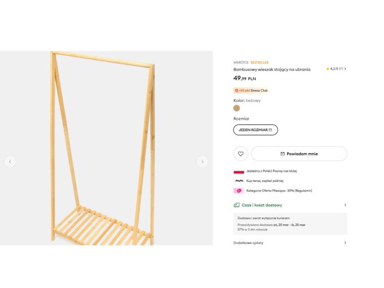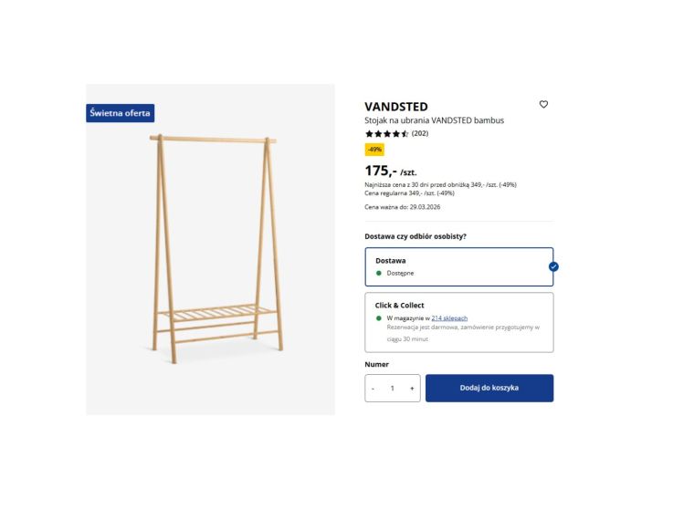 Najbardziej zaskakuje tutaj cena, bo to właśnie ona robi cały efekt wow. W Sinsay za bambusowy wieszak stojący na ubrania zapłacisz 49,99 zł. Tymczasem stojak na ubrania vandsted z bambusa w Jysk po przecenie kosztuje aż 175 zł. To już nie jest drobna oszczędność, tylko naprawdę konkretna suma, za którą można dokupić jeszcze kilka dodatków do domu. Zerknij jak ładnie i solidnie prezentuje się wieszak z oferty Sinsay.
