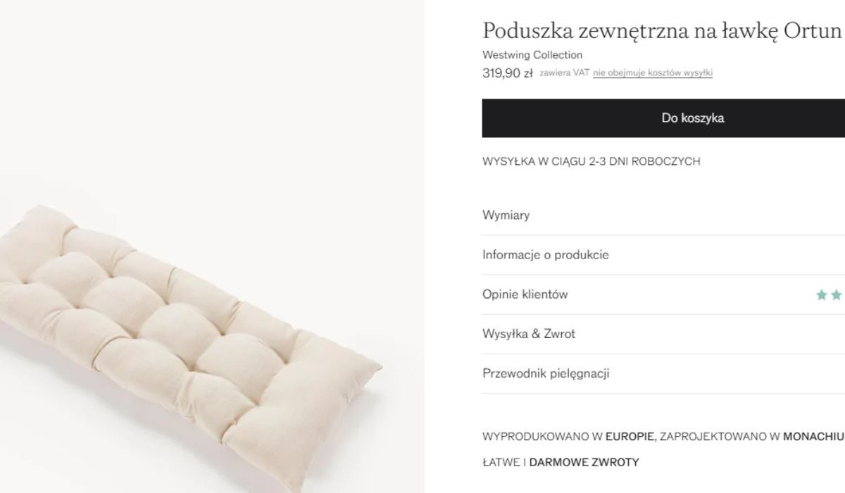 Dla porównania w Westwing można znaleźć poduszkę do siedzenia, która na pierwszy rzut oka wygląda bardzo podobnie. Ma jasny kolor, prostą formę i również jest przeznaczona do użytku na zewnątrz. Różnica pojawia się dopiero wtedy, gdy spojrzysz na cenę.
