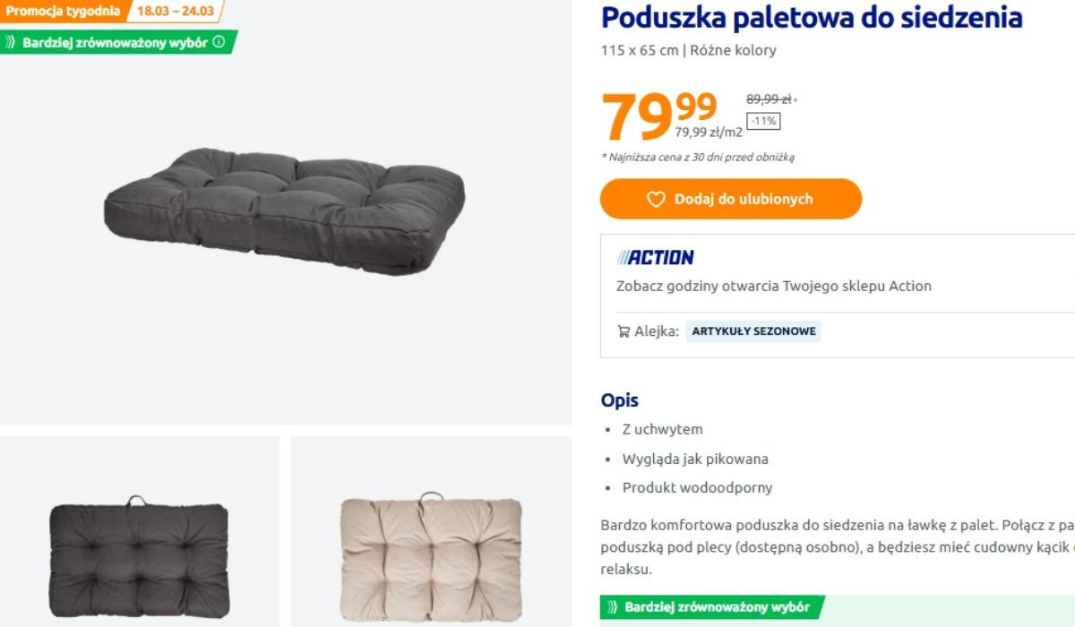W Action pojawiła się poduszka do siedzenia, która od razu przyciąga uwagę i aż zachęca, żeby na niej usiąść. Jest pikowana, gruba i wygląda bardzo przytulnie. Jej wymiary, 115 cm x 65 cm, sprawiają, że świetnie pasuje na ławkę albo meble z palet. Dzięki temu bez większego wysiłku można stworzyć wygodny kącik do odpoczynku. Wystarczy ją rozłożyć i balkon od razu zyskuje zupełnie inny, bardziej dopracowany wygląd.