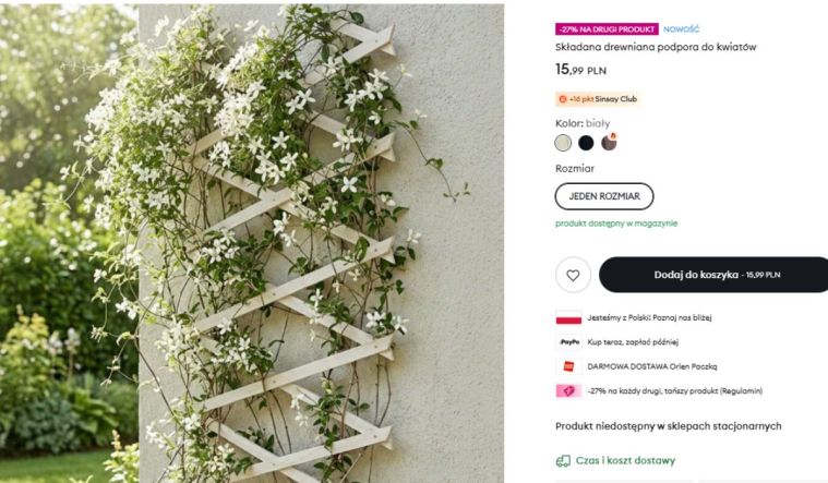 Tu pojawia się rozwiązanie z Sinsay, które kosztuje zaledwie 15,99 zł. To składana drewniana kratka, którą można zamontować bezpośrednio na ścianie nad donicą. Bez konieczności kupowania całego zestawu, bez przepłacania i bez kompromisów estetycznych. Efekt? Rośliny zaczynają piąć się w górę, tworząc zieloną dekorację, która wygląda znacznie drożej, niż kosztowała.