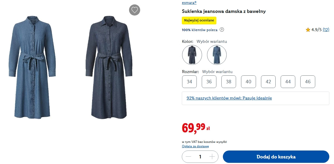 Wersja niebieska posiada stójkę z falbanką, natomiast ciemnoniebieska wyposażona jest w klasyczny kołnierzyk kent oraz kieszenie na piersi. Sukienka dostępna jest w rozmiarach od 34 do 46, co pozwala dobrać odpowiedni wariant do różnych typów sylwetek. Warto też zwrócić uwagę na cenę, ponieważ podobne sukienki w innych popularnych sieciówkach potrafią kosztować nawet 2 razy więcej.