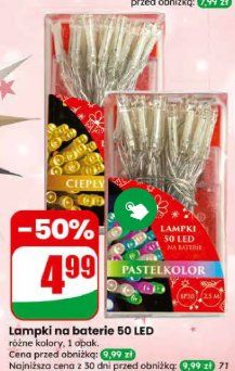 Dino przygotowało atrakcyjną ofertę dla klientów poszukujących świątecznego klimatu. Zaczynają promocję od oświetlenia. Lampki z 50 światełkami Led teraz objęte są promocją 50%. Więc zamiast standardowej ceny 9,99 zł, możesz je mieć za jedyne 4,99 zł.