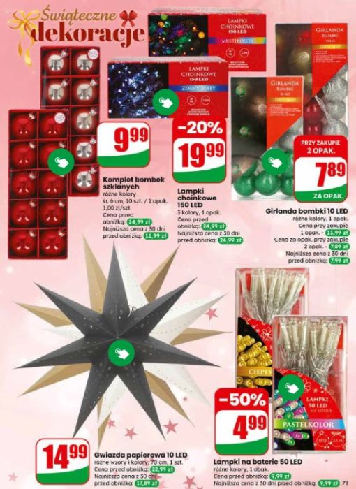 Oprócz promocyjnej oferty na 50-ledowe lampki świąteczne, Dino w swojej świątecznej gazetce prezentuje kilka innych ciekawych dekoracji. W asortymencie znajdziesz też komplet bombek szklanych, dostępnych w różnych kolorach i wzorach. Mają one średnicę 6 cm i są w opakowaniu po 10 sztuk. Znajdziesz je w cenie 9,99 zł za komplet. Dostępne są również większe lampki choinkowe ze 150 ledami, przecenione o 20% na 19,99 zł za 1 opakowanie. Są oferowane w wersjach multicolor i zimny biały. Będą świetne do większych drzewek lub dekoracji.