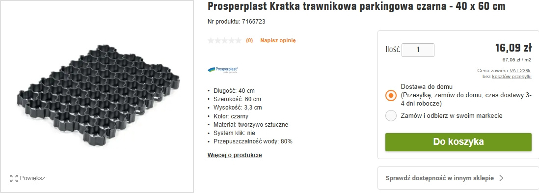 W porównaniu z popularną od lat kostką w nowoczesnym wzorze oraz kolorze geokrata wychodzi naprawdę korzystnie. Jedną z lepszych ofert proponuje Obi. Znana sieciówka budowlana proponuje kratkę marki Posperplast w kolorze czarnym w cenie 16,09 zł za jedną sztukę (67,05 mkw) o wymiarach: długość 40 cm, szerokość 60 cm, wysokość 3,3 cm.