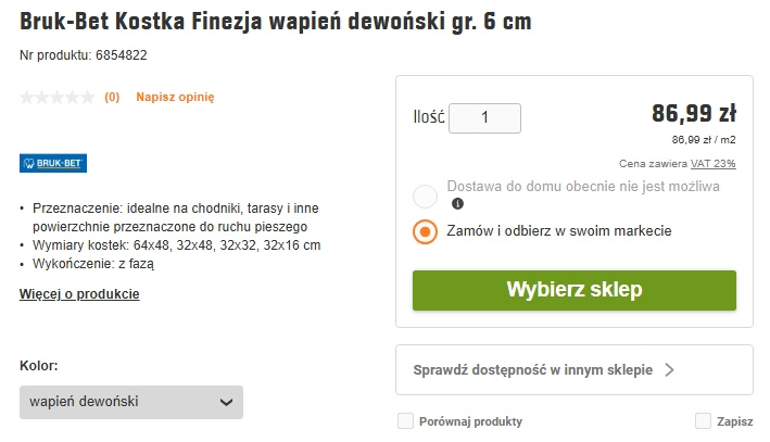 Dla porównania jedna z chętnie wybieranych przez Polaków kostek, dokładnie Finezja wapień dewoński marki Bruk-Bet dostępna w Obi, kosztuje 86,99 zł za mkw.