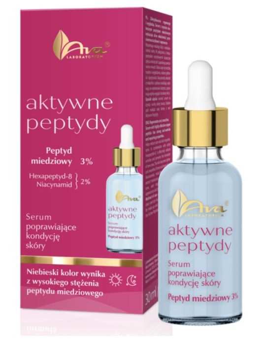 Jeśli szukasz prawdziwego hitu z drogeryjnej półki, koniecznie zwróć uwagę na serum Ava z linii Aktywne Peptydy. Jest ono dostępne m.in. w Hebe za jedyne 54,99 zł. To kosmetyk, który przyciąga wzrok swoim niezwykłym, błękitnym kolorem. Co ważne, nie jest on zasługą sztucznych barwników, a bardzo wysokiego stężenia peptydu miedziowego. Ten składnik naprawia mikrouszkodzenia skóry (np. po bliznach) i stymuluje skórę do odnowy. W składzie znajdziesz również:
