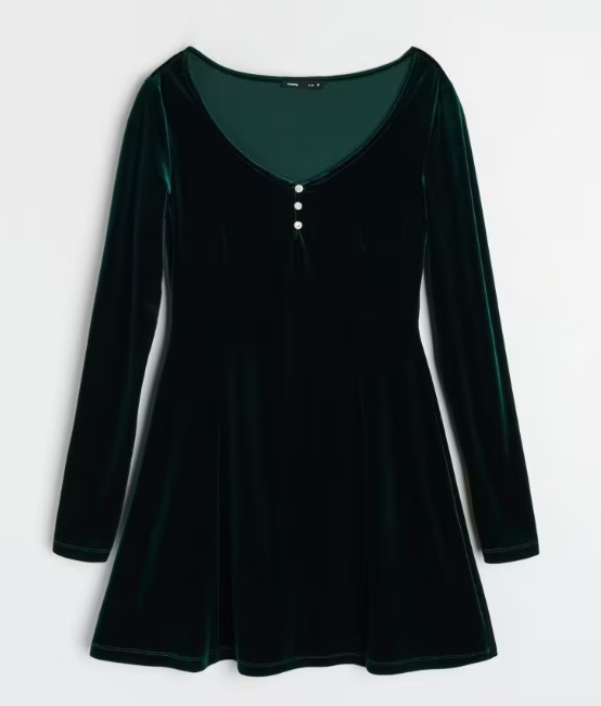 Sinsay także przygotował welurową opcję, po którą chętnie sięgają kobiety poszukujące świątecznej kreacji. Sukienka kosztuje 39,99 zł i występuje w szerokiej rozmiarówce od XS do XXL. Ma długość mini, dekolt V i dopasowane rękawy, co tworzy spójną i bardzo kobiecą formę. Materiał stanowi połączenie poliestru, weluru i elastanu, dzięki czemu tkanina ładnie układa się na sylwetce i zapewnia swobodę ruchów.