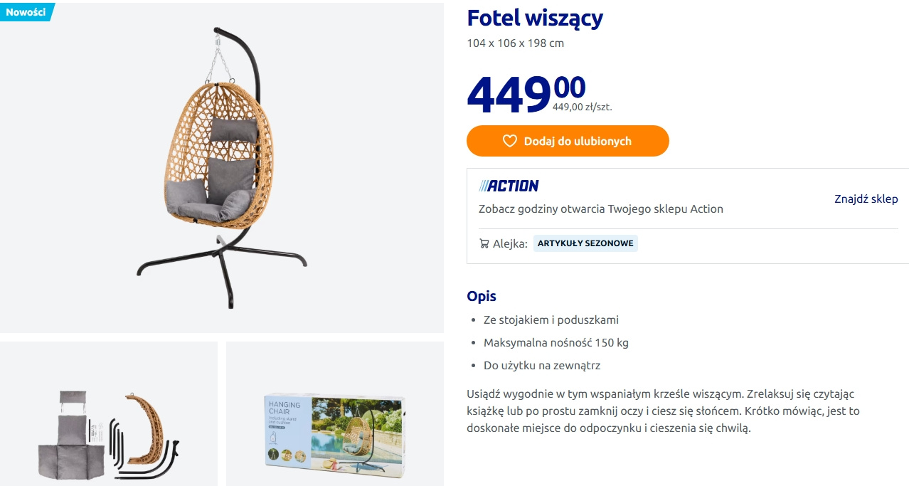 W Action pojawiła się nowość, która wywołała prawdziwe poruszenie. Fotel wiszący o wymiarach 104 x 106 x 198 cm kosztuje 449 zł. W zestawie znajduje się stelaż oraz poduszki, a maksymalna nośność wynosi 150 kg. Już na pierwszy rzut oka widać, że stylistycznie mocno przypomina droższe modele z innych sklepów.