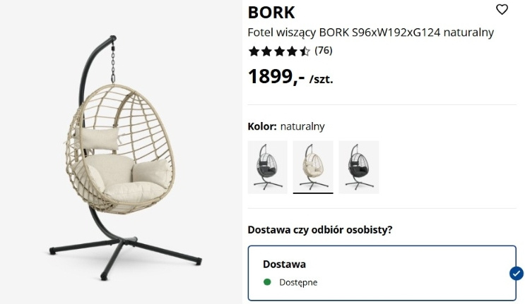 W Jysk dostępny jest model w naturalnym odcieniu z jasnymi poduszkami i czarnym stelażem. Prezentuje się bardzo stylowo i przypomina meble z katalogów wnętrzarskich. Ażurowy kosz otula ciało, a grube poduszki zachęcają, by usiąść i zostać na dłużej. To propozycja dla osób, które cenią estetykę i solidne wykonanie.