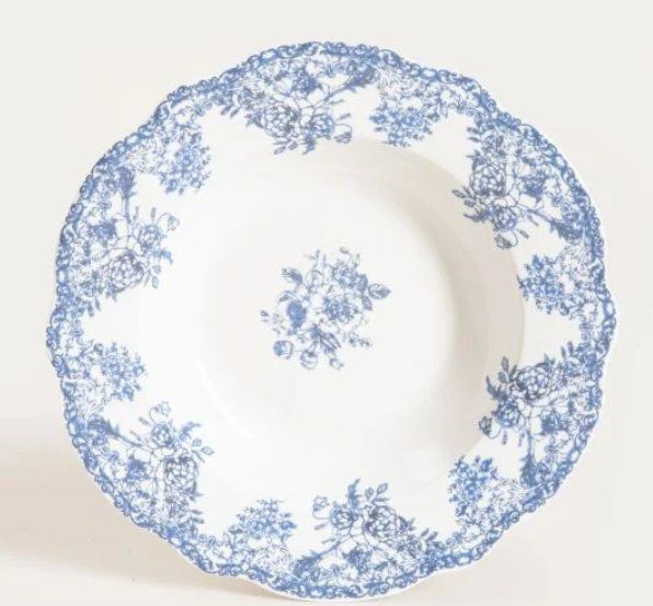 Talerze o średnicy 22 cm to niezwykle łatwy element do tworzenia stołowej kompozycji. Ich granatowy wzór z falowanym wykończeniem sprawia, że świetnie prezentują się na każdym rodzaju blatu. Między innymi na drewnie, marmurze czy obrusach.