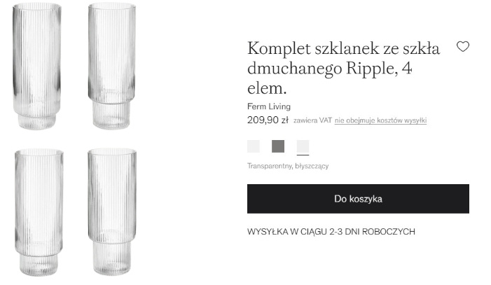 W ofercie Westwing dostępny jest komplet szklanek z serii RIPPLE marki Ferm Living. Zestaw 4 szt. kosztuje 209,90 zł, co daje około 52 zł za 1 szt. Każda szklanka ma średnicę 6 cm, wysokość 14 cm i pojemność 300 ml. Jest to szkło dmuchane ręcznie, co podkreśla jego rzemieślniczy charakter.