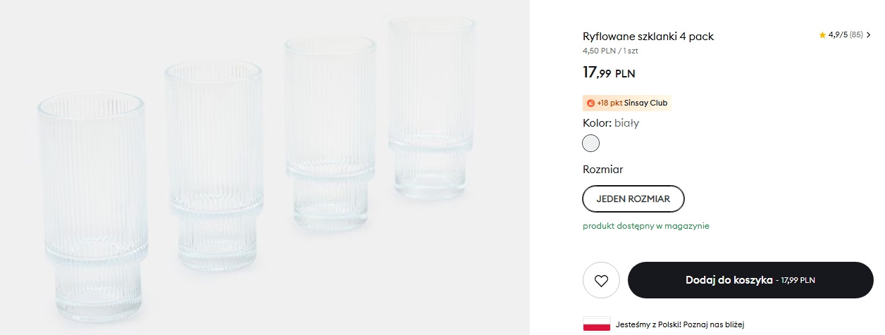 Ryflowane szkło znów wraca do łask i wszystko wskazuje na to, że zostanie z nami na dłużej. Wystarczy szybki przegląd mediów społecznościowych, by zobaczyć, że to właśnie delikatne pionowe żłobienia królują na stołach, komodach i w kuchennych witrynach. Tym razem uwagę przyciągają szklanki. W Westwing za 1 szt. trzeba zapłacić 52 zł, podczas gdy w Sinsay 1 szt. w zestawie 4 kosztuje zaledwie 4,50 zł. Różnica w cenie jest zauważalna i to właśnie ona sprawia, że Polki masowo sięgają po tańszą alternatywę.