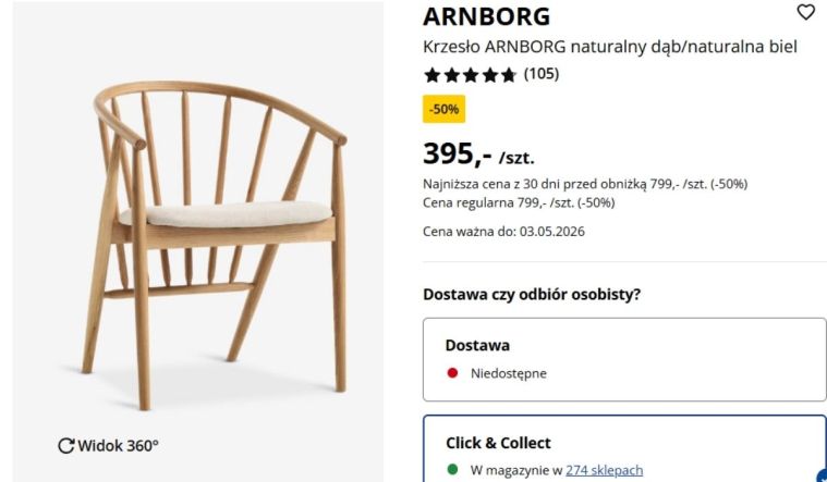 Krzesło z Jysk ARNBORG to model, który aktualnie można kupić z rabatem aż 50%. Zamiast 799 zł kosztuje 395 zł, co przy tej jakości wykonania robi naprawdę duże wrażenie i sprawia, że wiele osób decyduje się na zakup od razu kilku sztuk do kompletu.