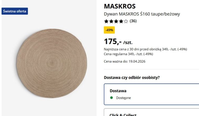 No i najważniejsze. Ten dywan na balkon jest teraz na wyprzedaży w Jysk z rabatem aż 174 zł. Cena spadła niemal o połowę, co przy tak uniwersalnym produkcie sprawia, że trudno się dziwić rosnącemu zainteresowaniu. To właśnie takie okazje najczęściej znikają jako pierwsze. Promocja jest ważna do 19.04.2026.