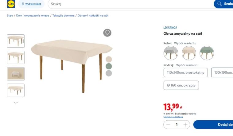 Zmywalny obrus z Lidla dostępny jest w kilku praktycznych wariantach, dzięki czemu można go dopasować do różnych typów stołów. Do wyboru są zarówno modele prostokątne w rozmiarach 110 × 140 cm oraz 130 × 190 cm, jak i wersja okrągła o średnicy 160 cm. To sprawia, że sprawdzi się zarówno na małym stoliku balkonowym, jak i większym stole na tarasie.