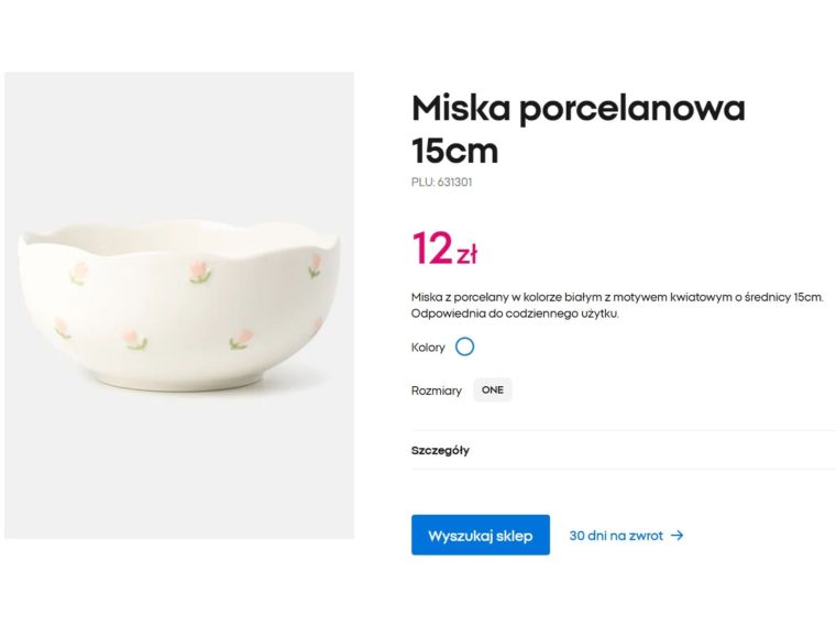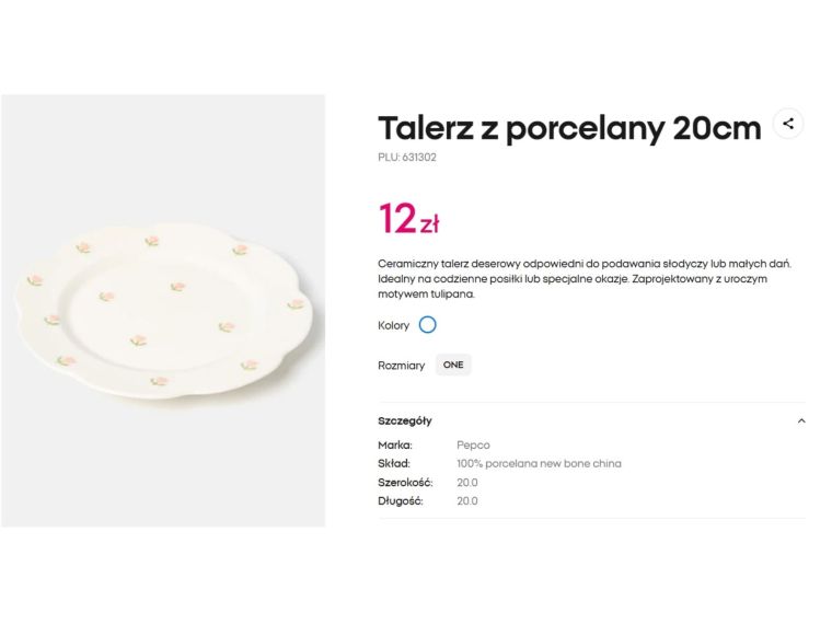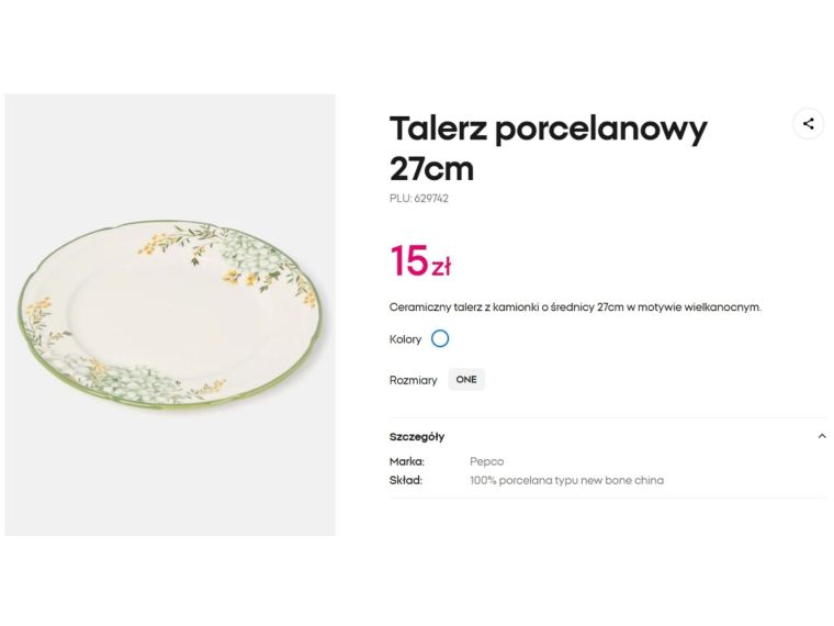 W Pepco za talerz o tej samej średnicy zapłacimy zaledwie 15 zł. Co istotne, produkt wykonano w 100% z porcelany typu new bone china, co przekłada się na lekkość, elegancki połysk i trwałość. Różnica w cenie jest więc wyraźna – przy zakupie kompletu dla czterech osób oszczędność sięga kilkudziesięciu złotych.