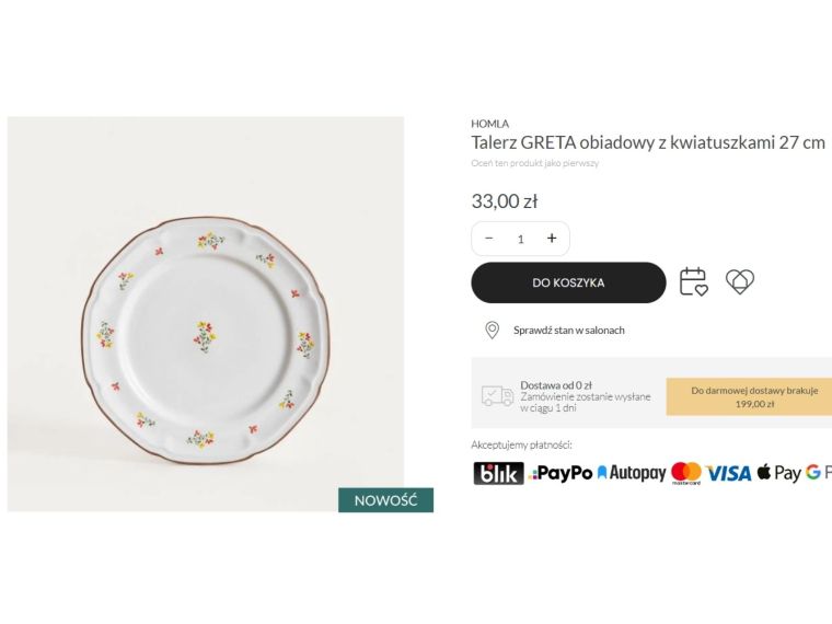 Największe zainteresowanie budzi porcelanowy talerz o średnicy 27 cm w romantycznym, roślinnym wydaniu. Subtelny zielony rant i delikatne kwiatowe zdobienia przywodzą na myśl propozycję z Homla, gdzie podobny model kosztuje 33 zł.
