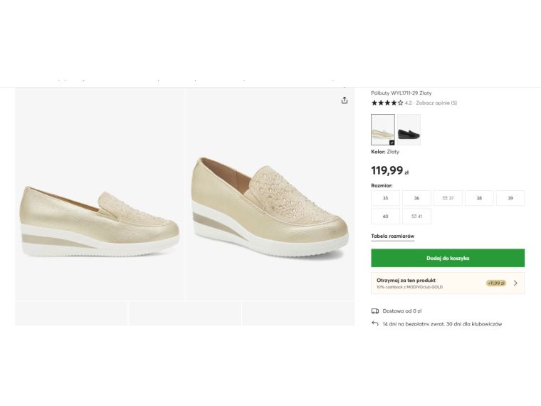 Złoty kolor wcale nie musi być krzykliwy. W tym modelu jest subtelny, ciepły i bardzo twarzowy. Największe wrażenie robią jednak drobne cyrkonie na nosku, które delikatnie połyskują jak krople rosy w porannym słońcu. To właśnie te detale sprawiają, że but wygląda na znacznie droższy, niż wskazuje cena 119,99 zł.