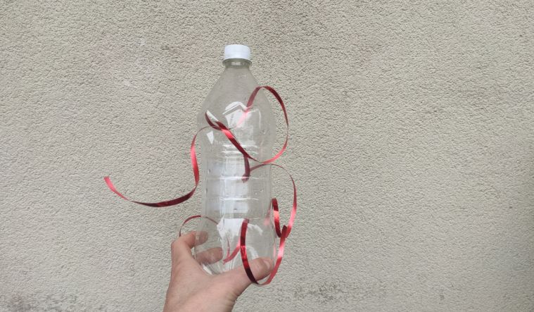 Do przygotowania „odstraszacza” potrzebujesz zwykłej plastikowej butelki o pojemności 1-1,5 litra oraz kilku błyszczących wstążek. Mogą być w dowolnym kolorze – najważniejsze, aby miały połysk i dobrze odbijały światło. Im bardziej błyszczące, tym lepiej spełnią swoją funkcję. Ja użyłam wstążek, które zostały mi po pakowaniu prezentów.